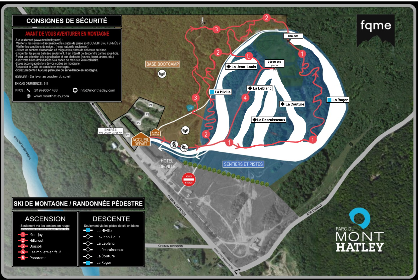 - Accès via le Camp de base P1 (4745 chemin Capelton, Canton de Hatley).